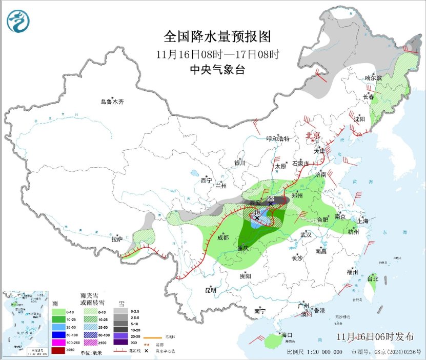 冷空气南下,将与西南暖湿气流在秦岭一带相遇,秦岭及其周边地区将有较强雨雪天气。预计今天,内蒙古东北部、东北地区东部和北部、西北地区东南部、陕西中南部、黄淮西部、江汉西部、川西高原北部、重庆北部等地部分地区有小到中雪或雨夹雪,其中,陕西南部、重庆北部、河南西部、川西高原北部等地部分地区有大雪,秦岭及大巴山局地有暴雪或大暴雪(20~22毫米),新增积雪深度6~12厘米,局地可超过15厘米。