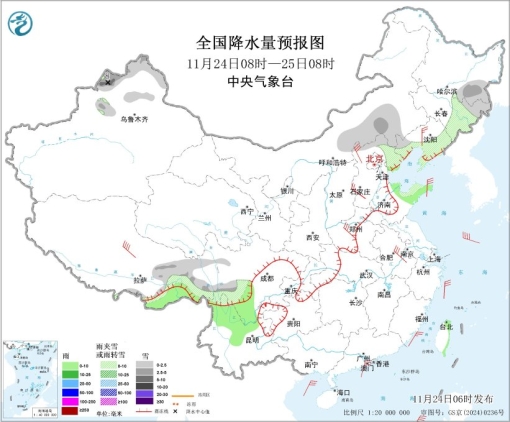 在降水方面,24日,我国大部地区降水稀少,仅新疆北部、内蒙古东南部、东北地区东部及青藏高原东部有小到中雪或雨夹雪,新疆西北部局地大雪;25日,新疆天山一带、甘肃西部、内蒙古东北部、黑龙江西北部及西藏东部、川西高原北部等地有小到中雪或雨夹雪,新疆沿天山、西藏东部、川西高原中部局地大雪;26日,内蒙古中部、东北地区中南部、华北北部及川西高原南部等地有小到中雪或雨夹雪。