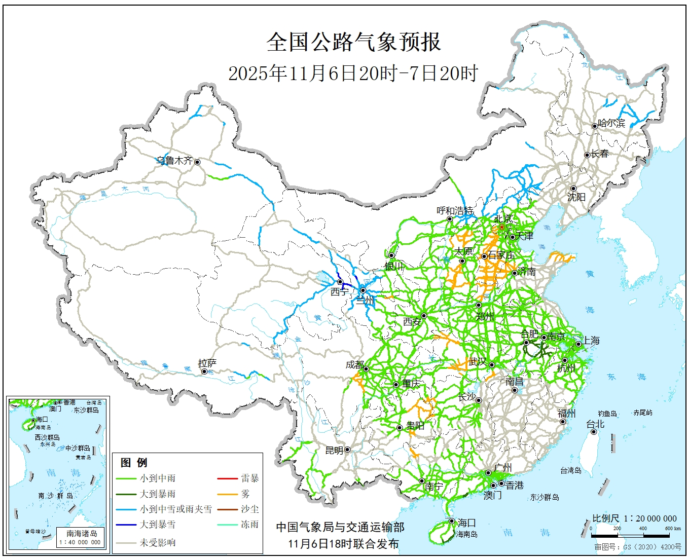 11月5日20时至6日20时,山西东北部、内蒙古东北部、黑龙江大部、甘肃大部、青海北部、新疆北部等地部分地区有小到中雪或雨夹雪,其中,新疆沿天山地区等地部分地区有大到暴雪,局地大暴雪。另外,北京南部、天津、河北中南部、山东、江苏西北部、安徽北部、湖南中部等地的部分地区有大雾。