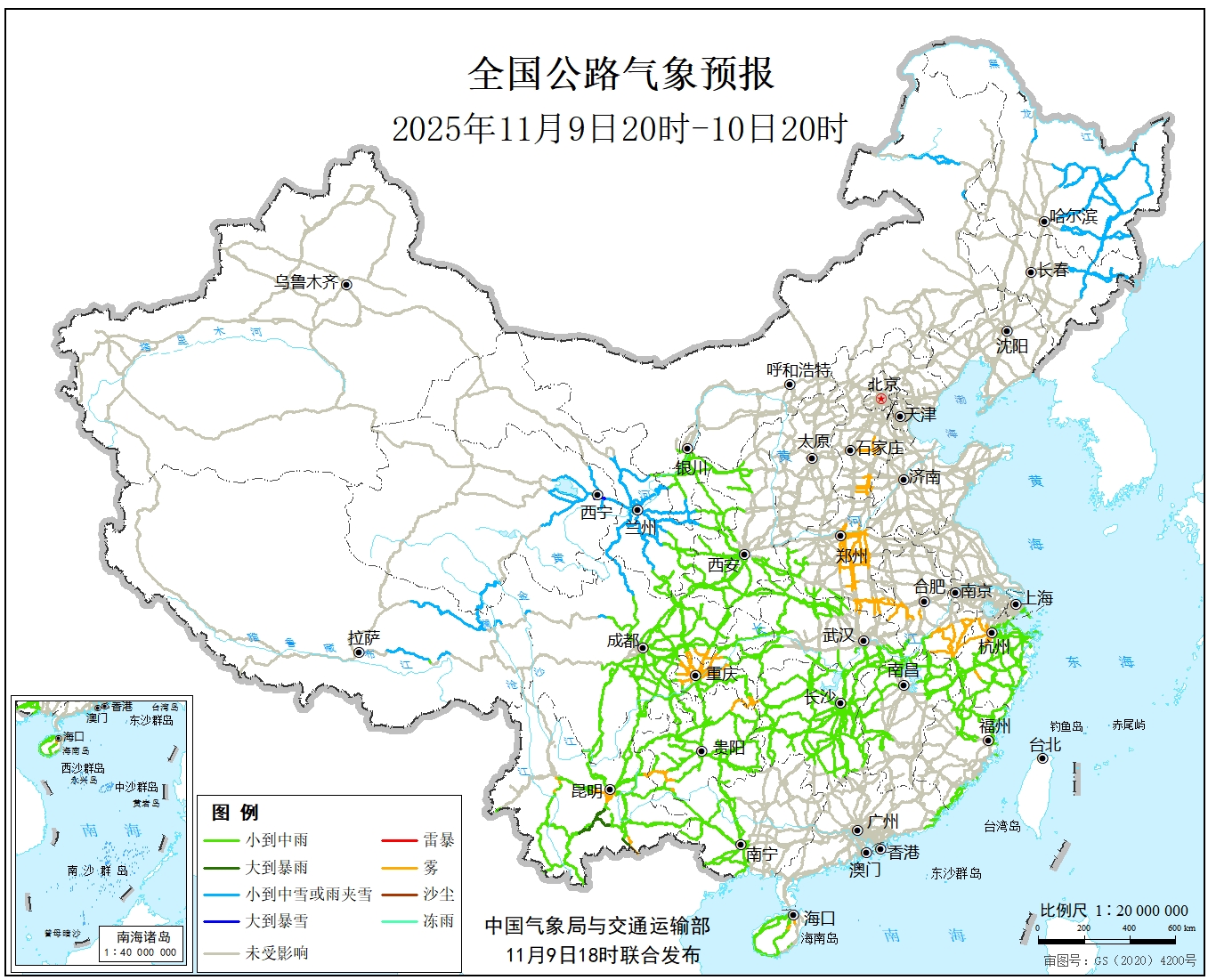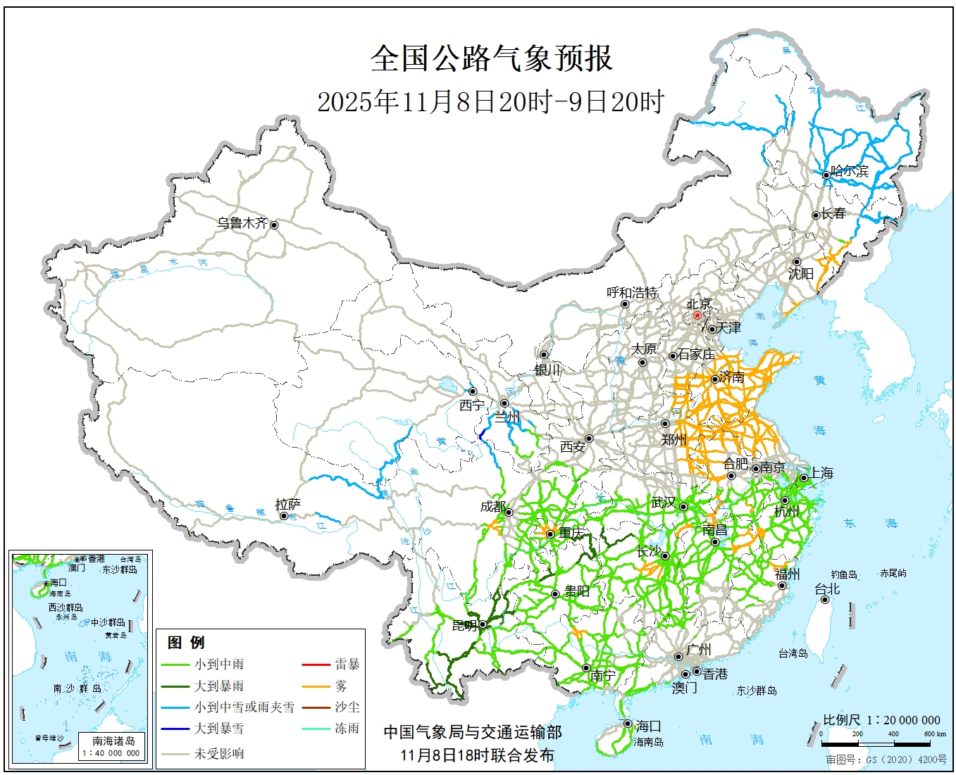 11月8日20时至9日20时,内蒙古东部、东北地区东部和北部、西藏东北部、西北地区中部、川西高原北部等地部分地区有小雪或雨夹雪,其中,内蒙古东北部、黑龙江北部、青海南部、甘肃南部等地部分地区有中到大雪。江汉南部、江南北部、重庆中部、西南地区南部等地部分地区有中到大雨,其中,云南西南部等地局地有暴雨。另外,河南东部、山东大部、安徽北部、江苏北部、湖北东部、江西东北部、重庆西南部、辽宁东部等地局地有雾。