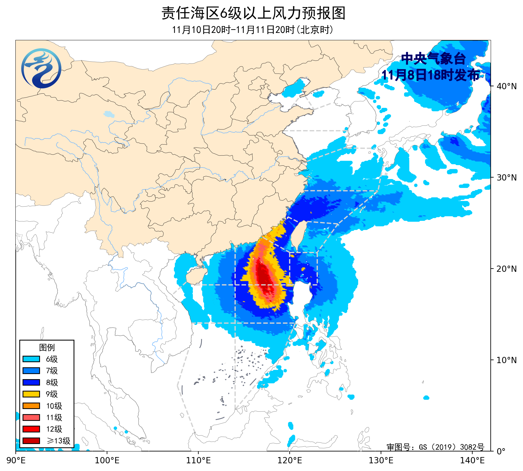 9日20时至10日20时,南海中东部海域将有11~12级、阵风13级的偏北风,南海东北部海域将有9~11级、阵风12级的东北风,巴士海峡将有8~10级、阵风11级的东北风到偏东风,台湾海峡将有8~9级、阵风10级的东北风,东海南部海域、台湾以东洋面将有6~8级、阵风9级的东北风,东海北部海域、南海西北部和中西部海域将有6~7级、阵风8级的偏北风,南海东南部海域将有6~7级、阵风8级的偏西风,渤海将有5~6级、阵风7级的西北风到偏西风,渤海海峡将有5~6级、阵风7级的西北风减弱到4级以下的西南风,黄海大部海域将有4~6级、阵风7级的偏北到西北风。