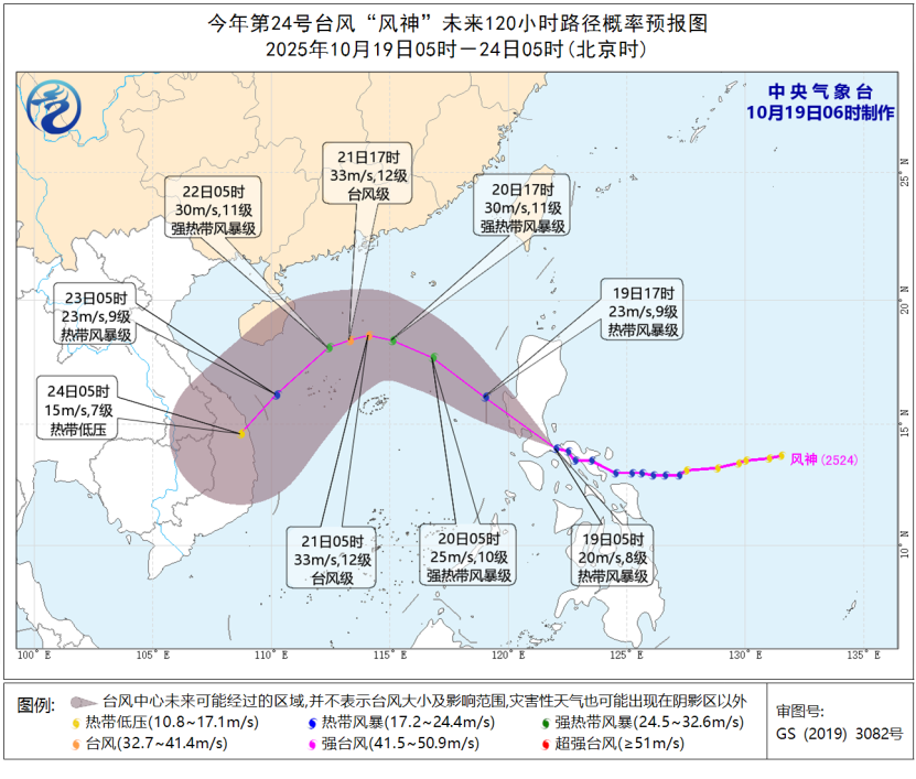 大风预报:受冷空气和“风神”的共同影响,19日08时至20日08时,台湾海峡、巴士海峡、南海北部和中部、西沙群岛、中沙群岛及黄岩岛附近海域、北部湾、琼州海峡、东海西部、浙江沿海、台湾沿海、福建沿海、广东沿海、广西沿海、海南岛沿海将有6-8级大风,阵风9-10级,其中东海西部、浙江沿海、台湾海峡、台湾西部沿海、福建沿海、广东东部沿海和南海东北部的部分海域风力有9-10级,阵风11-12级。