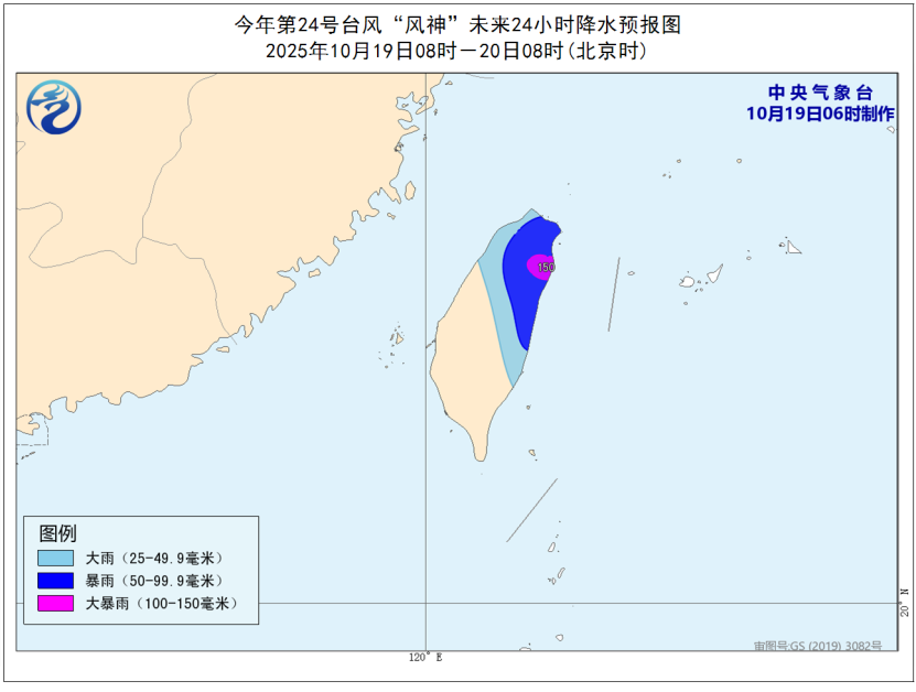 降水预报:19日08时至20日08时,台湾岛中北部有大到暴雨,其中,台湾岛东北部的部分地区有大暴雨(100-150毫米)。