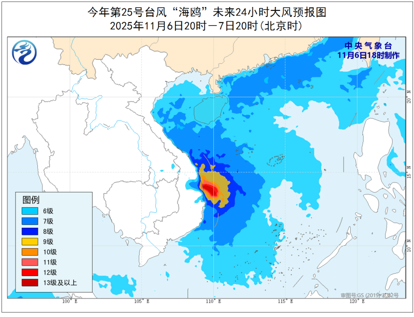 今年第25号台风“海鸥”已于今天(6日)下午由超强台风级减弱为强台风级,下午5点钟其中心位于越南嘉莱省归仁市东偏南方向大约95公里的南海西南部海面,就是北纬13.5度、东经110.1度,中心附近最大风力有15级(48米/秒),中心最低气压为945百帕,七级风圈半径180-250公里,十级风圈半径80-120公里,十二级风圈半径30-50公里。