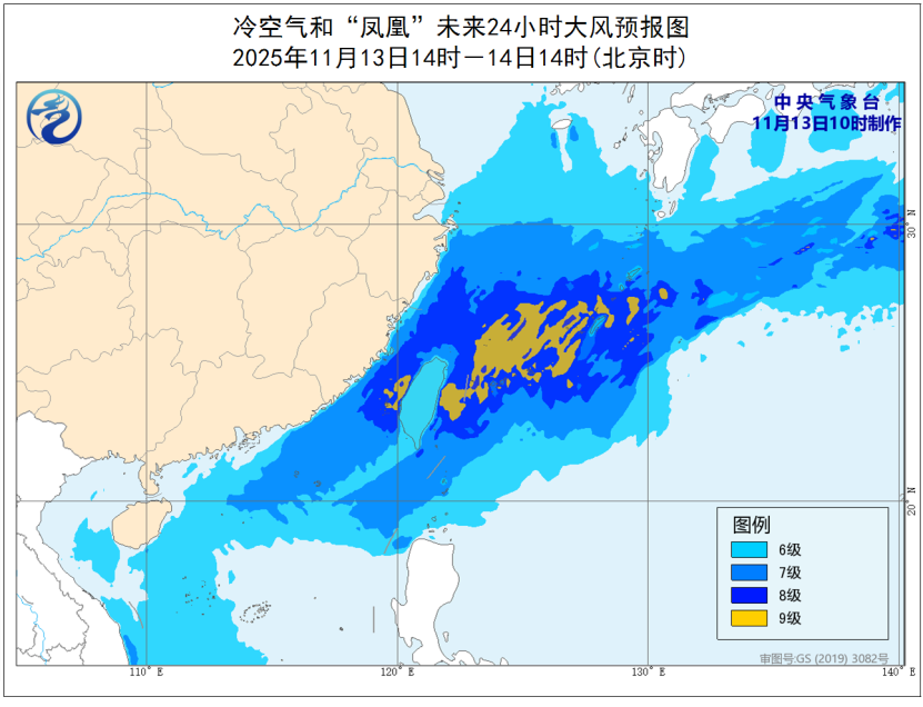 大风预报:13日14时至14日14时,东海大部、台湾海峡、台湾以东洋面、巴士海峡、南海东北部、台湾岛沿海、福建沿海、浙江沿海将有6~8级、阵风9~10级的大风,其中,东海南部、台湾海峡和台湾以东洋面的部分海域风力可达9级,阵风10~11级。