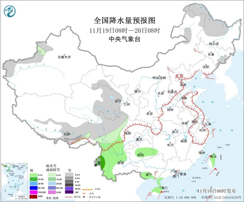 预计今天,雨雪天气将主要分布在青藏高原中东部和云南、广西等地,青海南部、川西高原北部、西藏中部和北部、甘肃西部、新疆东南部有小到中雪或雨夹雪;云南南部、广西南部及台湾岛北部有中到大雨。