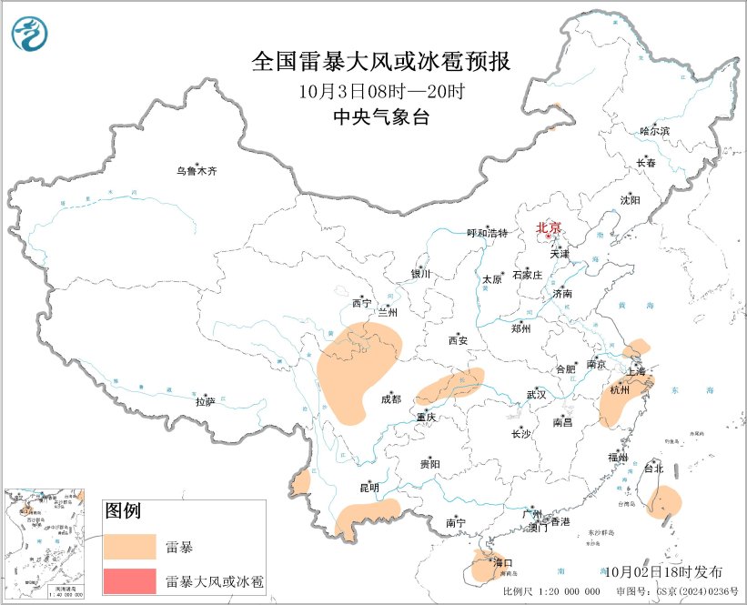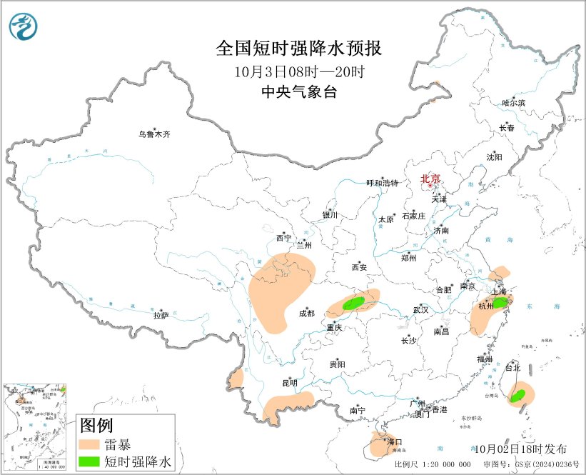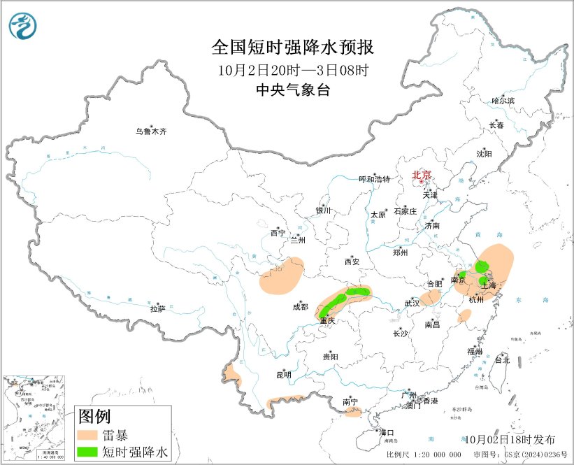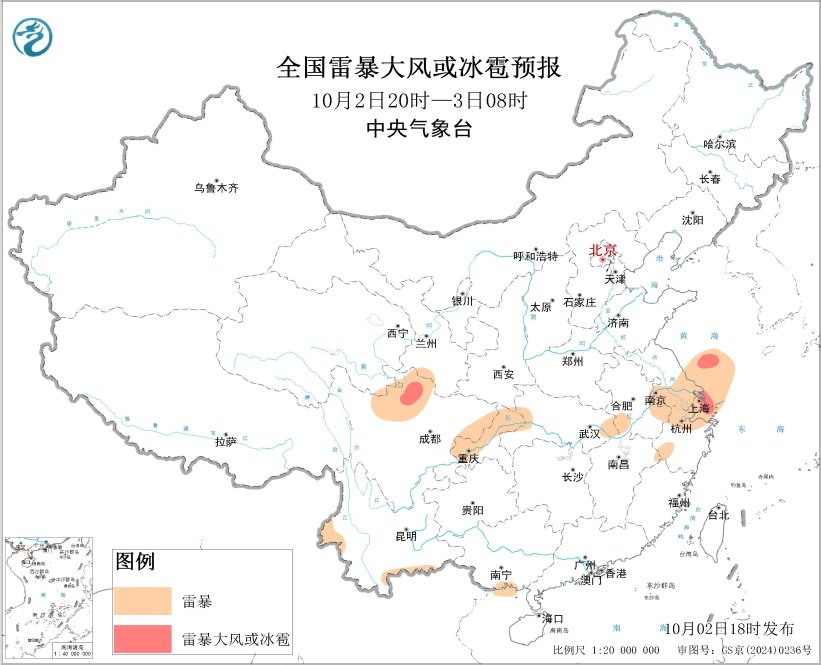 预计10月2日20时至3日20时,江苏南部、上海北部和西部、浙江东北部、湖北西部、四川东北部、重庆中西部和东北部等地的部分地区将有短时强降水天气,小时雨量20-40毫米,局地可达50毫米以上;另外,上海东北部、四川西北部等地的局地将有雷暴大风或冰雹天气。