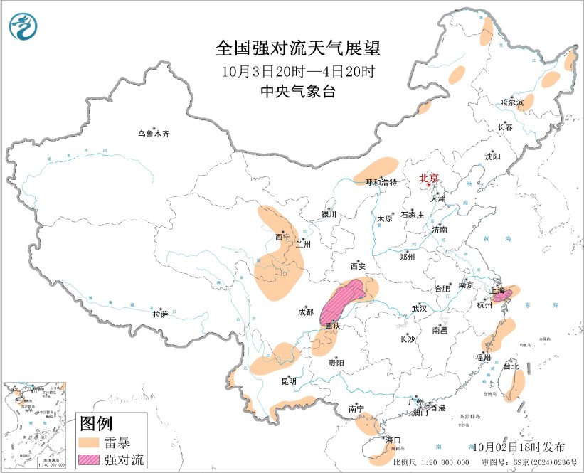 预计10月3日20时至4日20时,陕西南部、浙江东北部、四川东北部、重庆东北部和西部等地的部分地区将有强对流天气。