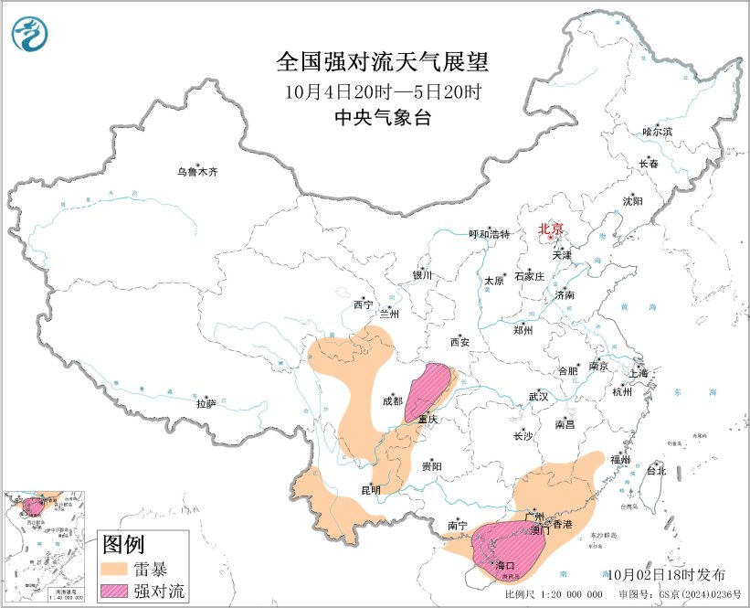 预计10月4日20时至5日20时,四川东北部、重庆西部、广西东南部、广东西南部、海南岛东北部等地的部分地区将有强对流天气。