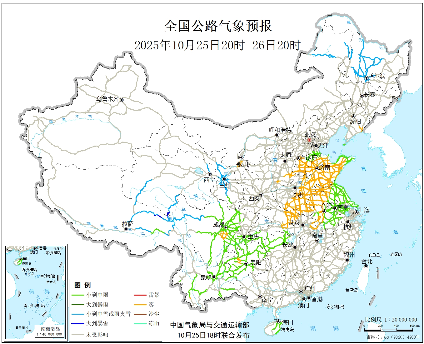 10月25日20时至26日20时,内蒙古东北部、黑龙江中西部、西藏北部、青海南部、甘肃南部、川西高原北部等地部分地区有小到中雪或雨夹雪,其中,西藏东北部、青海东南部等地局地有大到暴雪。西藏东南部、山东大部、安徽中部、江苏大部、湖南北部、西南地区大部等地部分地区有小到中雨。另外,河北南部、山东大部、河南东部、安徽北部、湖北北部等地局地有雾。