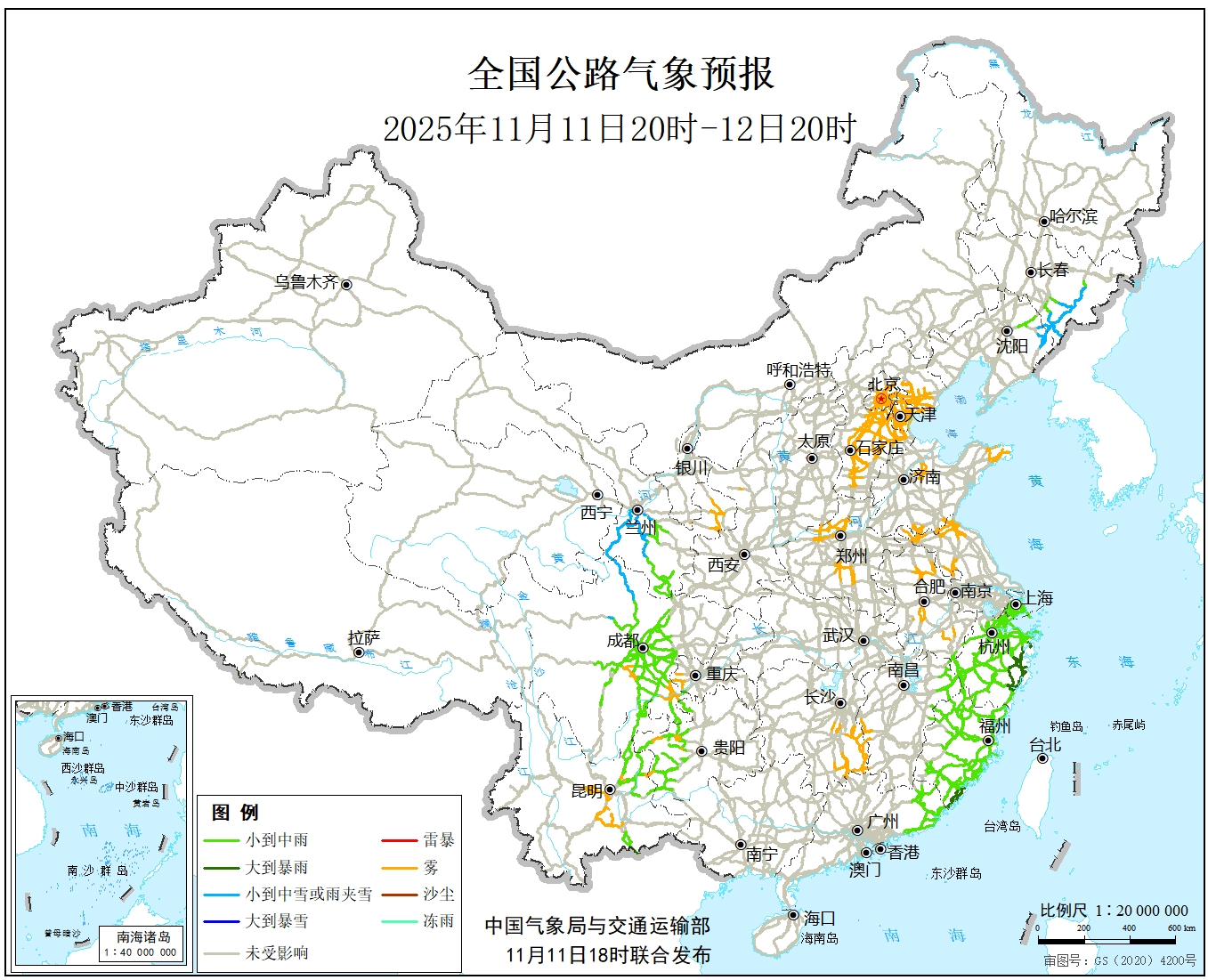 11月11日20时至12日20时,吉林东南部、辽宁东部、四川北部、甘肃中部等地局地有小到中雪或雨夹雪。浙江东部、福建东南部等地局地有大雨。另外,北京大部、天津、河北中南部、江苏中北部、安徽中部和东南部、江西西部、山东中部和东北部、河南中北部、湖南东南部、重庆西南部、四川东部、云南中部、甘肃东部等地局地有雾。