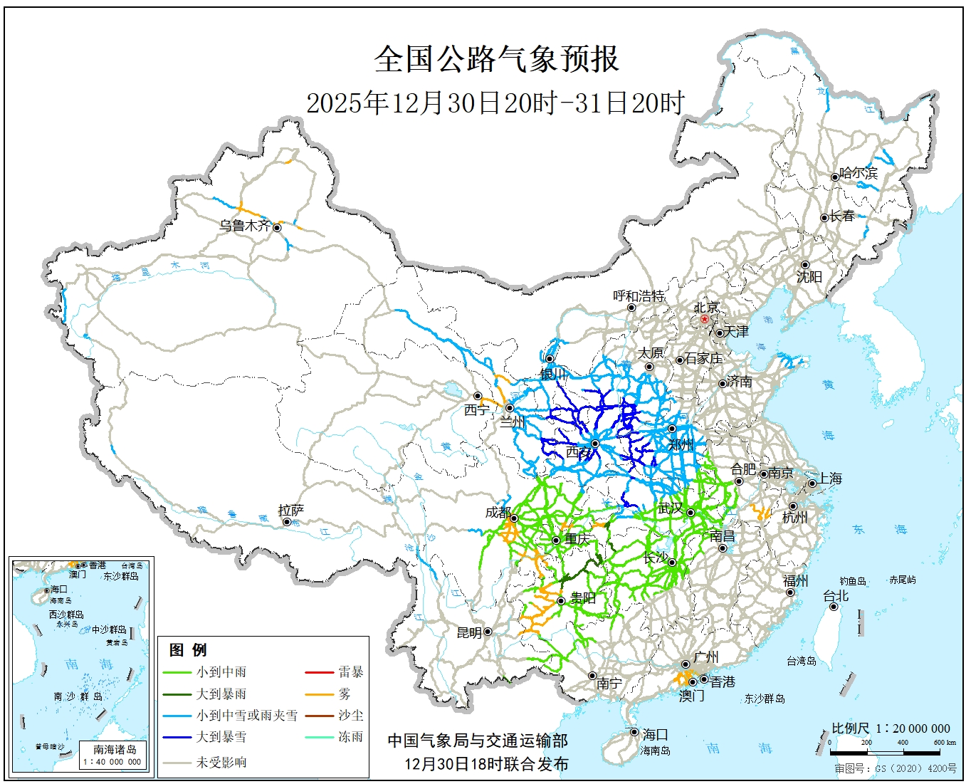 12月10日20时至11日20时,新疆北疆和南疆东部、东北地区东部、甘肃河西、陕西北部等地部分地区有小到中雪或雨夹雪,其中,吉林东部、新疆沿天山地区等地部分地区大雪,局地有暴雪。甘肃北部等地局地有沙尘。另外,江苏北部、山东南部、河南西南部、广西北部、重庆西部、四川中东部、贵州西部、云南北部、新疆北部等地局地有雾。