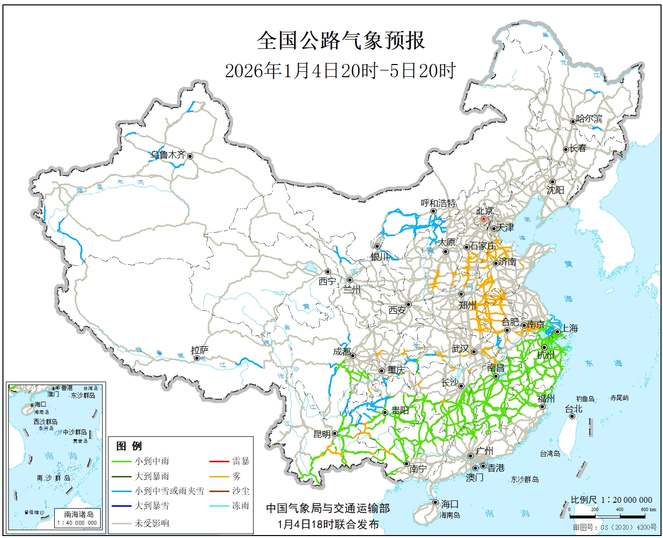 1月4日20时至5日20时,新疆北疆北部、沿天山地区和南疆西部山区、内蒙古中西部、黑龙江东部、西藏北部和东南部、青海西部、山西北部、湖北西南部、川西高原、贵州西北部、安徽西部等地部分地区有小雪或雨夹雪,其中,新疆南疆西部山区和西藏东南部局地有中雪。江南大部、西南地区东南部、广西中北部、广东北部等地部分地区有小雨,其中,湖南南部、贵州南部等地局地有中雨。贵州中部等地局地有冻雨。另外,河北南部、山西南部、江苏西北部和西南部、安徽中北部、江西北部、山东西部、河南东部和北部、湖北中东部、湖南北部、广西西北部、重庆北部和西南部、四川东部、贵州西部、云南南部等地局地有雾。